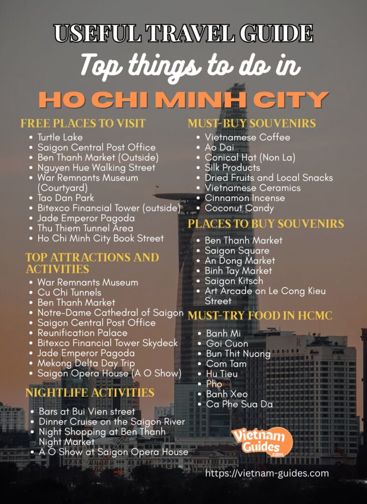 HCMC offers a wide range of attractions that appeal to history enthusiasts, food lovers, and modern urban explorers. Key heritage landmarks include the War Remnants Museum, Independence Palace, Saigon Central Post Office, and Notre Dame Cathedral, each reflecting important chapters of Vietnam’s past. The bustling Ben Thanh Market and nearby street-food alleys showcase the city’s lively culinary culture. District 1’s modern skyline is best appreciated from rooftop bars and riverfront promenades. For immersive cultural learning, travellers should not miss a day trip to the Cu Chi Tunnels or a sunset cruise on the Saigon River. Nature-oriented travellers may consider onward journeys to the Mekong Delta, guided by seasonal resources such as Mekong Delta in January. For curated urban recommendations, travellers may refer to Best Things to Do in Ho Chi Minh City, which highlights dining, markets, viewpoints, and cultural hotspots. Those planning extended travel around Vietnam may find links to Vietnam Travel 2-Week Itinerary helpful for multi-city planning.