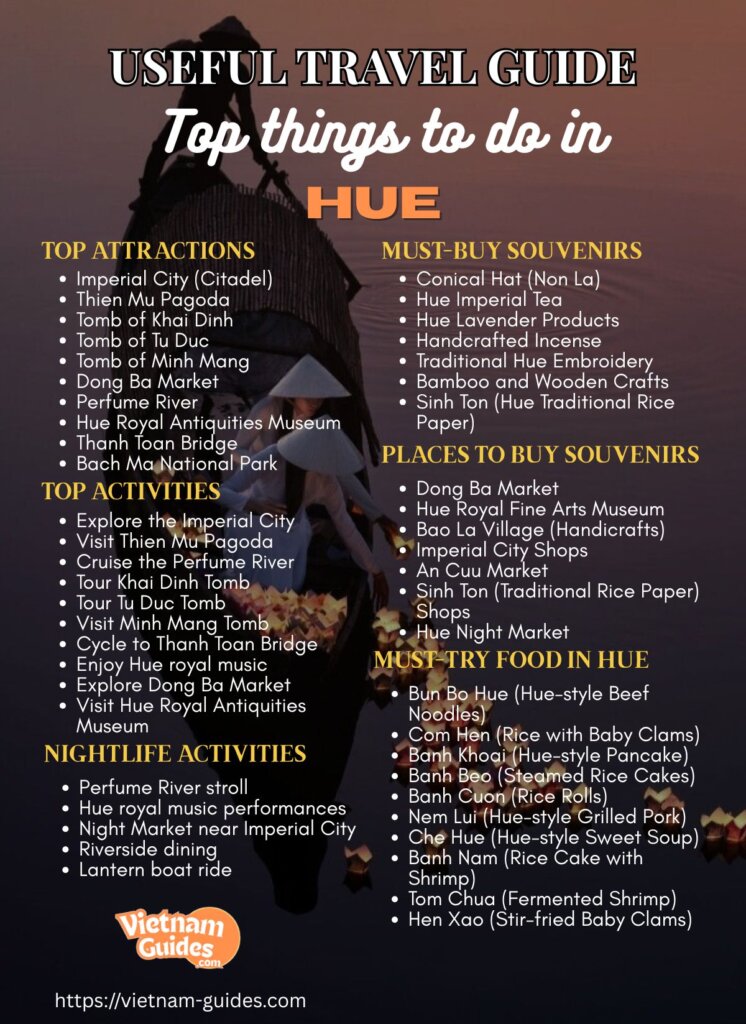 - Perfume River Boat Ride: A scenic cruise that takes you past historic sites and countryside views