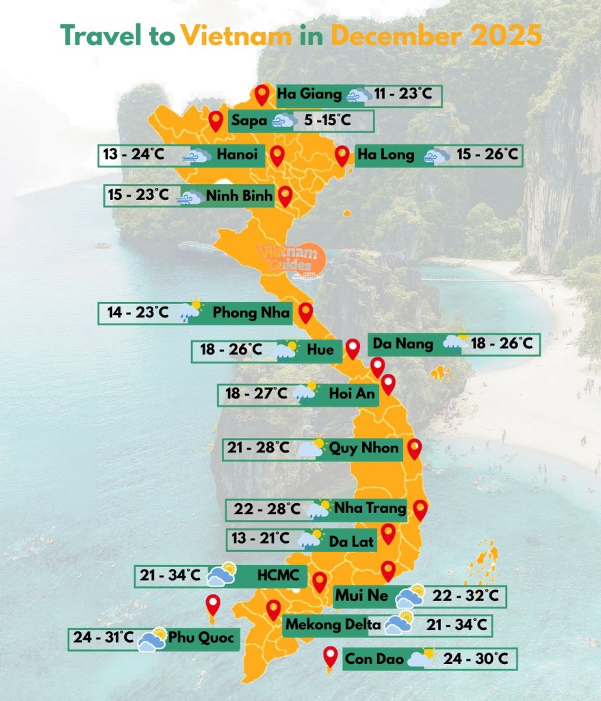 Vietnam in December is diverse, with the North experiencing cool winter breezes, the Central coast seeing its rainy season, and the South enjoying sunny, tropical days. It’s one of the best months to explore Vietnam’s contrasts: from misty mountains in Sapa to vibrant beaches in Phu Quoc, or festive celebrations in cities like Hanoi and Ho Chi Minh City.