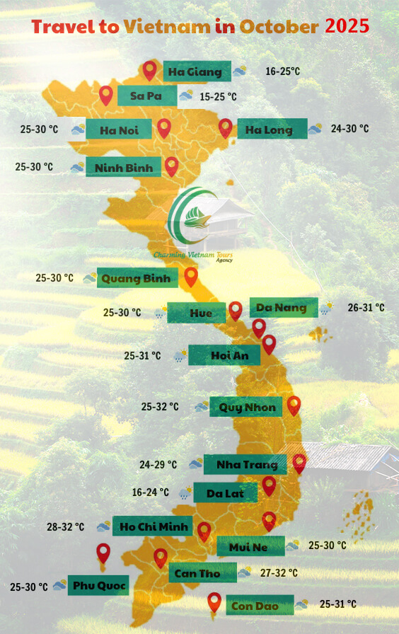 The weather in Vietnam in October is generally pleasant, with varying conditions across the country – the north experiences cooler, drier conditions, the central region sees heavy monsoon rains, and the south enjoys sunny, slightly less humid weather as the rainy season winds down.
